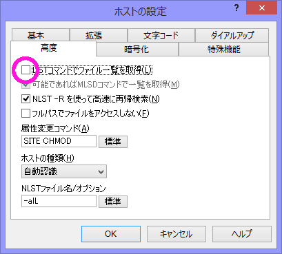 で、「LISTコマンドでファイル一覧を取得」のチェックをOFFにします。