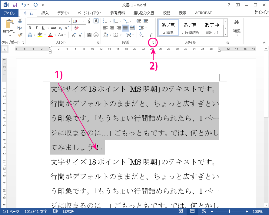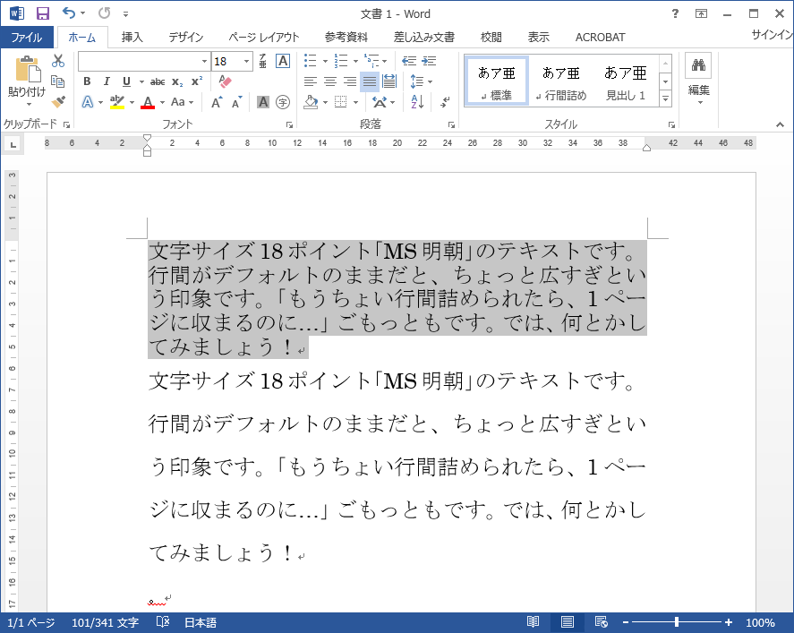 Wordは、デフォルトの行間設定にも癖がありますね。文字サイズを14ptくらいにすると、突然行間が広がります。広がりすぎですよね。例では文字サイズ18ptに設定してみましたが、やっぱり本文用には行間が広すぎと思います。