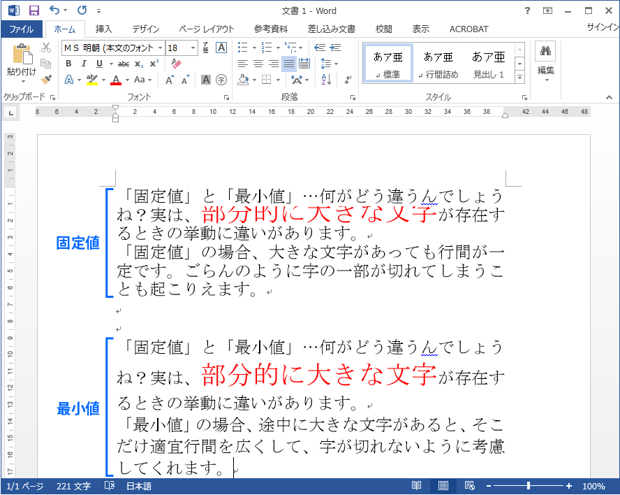 さて、先程の「段落」ダイアログで、「固定値」のほかに「最小値」という選択肢がありました。