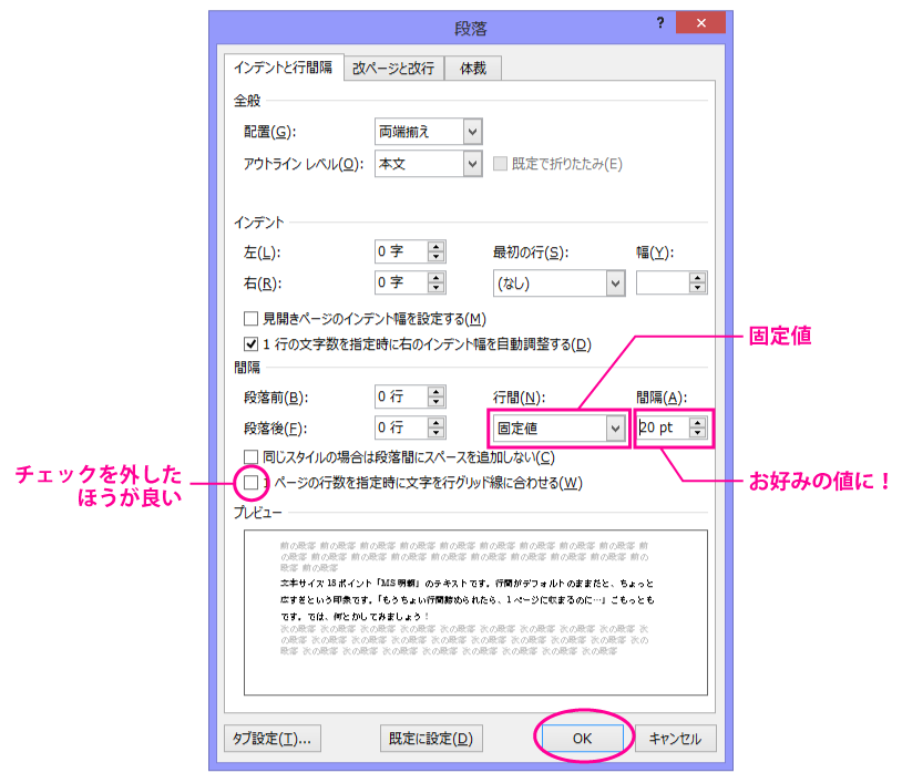 ●1ページの行数を指定時に文字を行グリッド線に合わせる(W)→チェックを外したほうが、思い通りの結果が得られると思います。