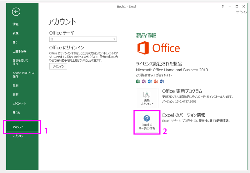 ○○○のバージョン情報をクリックします。画像はExcel 2013での例です。